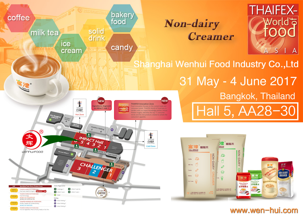 Wenhui Food will attend thaifex 2017 (booth no.:Hall5 AA28-30),welcome every friends to visit our booth. if you're interested in food ingredients(non-dairy cremaer), please feel free to contact us.